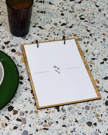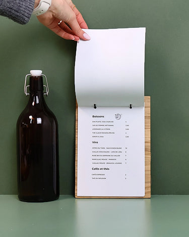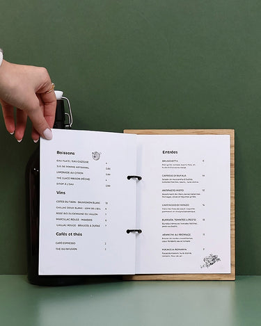 Épuré, pratique et chaleureux, ce porte-menu A5 en bois avec anneaux est conçu pour un usage quotidien en salle. Grâce à ses anneaux de classeur, placés en haut ou sur le côté gauche selon l’orientation souhaitée, vos feuilles restent parfaitement maintenues et se remplacent en un instant, au fil des saisons et des nouveautés.